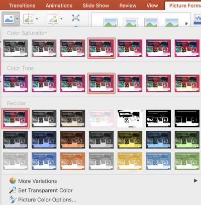 Click on it to see seven immediate preset options to make a picture transparent starting from the least transparent (or opaque) to the maximum transparency. These are quite handy for those of you whipping up a quick slide deck.